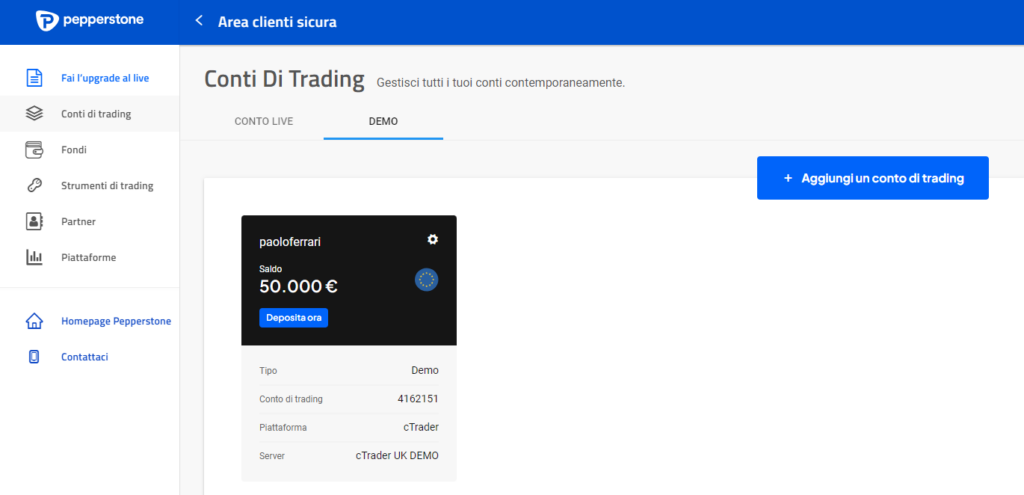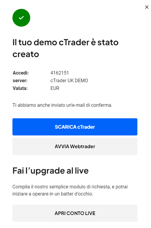 - APRI CONTO LIVE: per avere a tua disposizione anche il conto con fondi reali, oltre a quello demo.