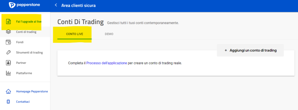 IMPORTANTE: nell’area clienti troverai sempre bene in evidenza i pulsanti “fai l’upgrade al live” per aggiungere il conto reale al conto demo, necessario per iniziare ad investire denaro reale (e mirare a risultati economici reali).
