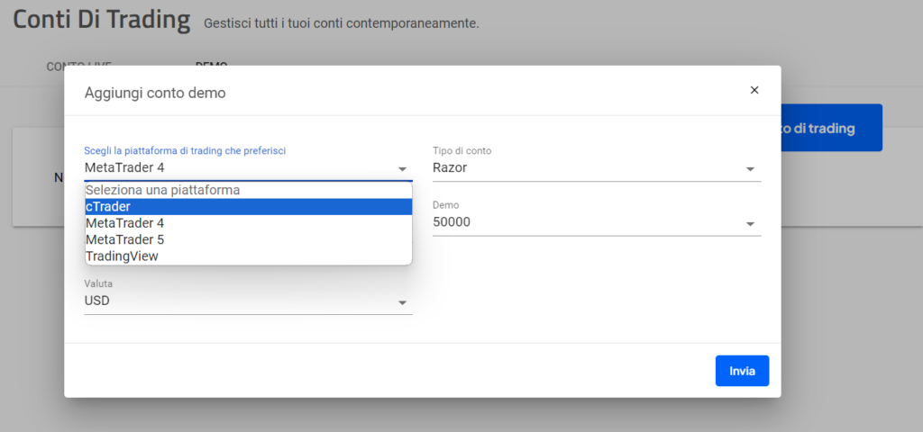 Una volta impostati i valori secondo le proprie preferenze, si può cliccare su Invia. In questo modo, si ottiene in modo immediato un conto demo sulla piattaforma selezionata.